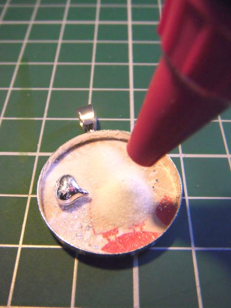 I then gave it a second coating of Mod Podge. This both glues the paper in place and seals the paper to prevent any of the inks from running. After leaving the trays to dry, I lined them up and put a small amount of an old embossing powder I had, to add some sparkle and put along side it a small heart shaped charm so that I could play with how easy it is to move items around and to add an extra dimension to the pendants. I dipped the tray in to the pot of Amazing Glaze, levelled it flat and then filled the second tray with the Fluxe.